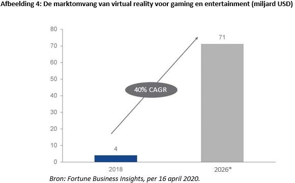 Volgens Fortune Business Insights had de VR-gamingmarkt in 2018 een omvang van USD 4 miljard met een verwachte groei tot USD 71 miljard in 2026 (zie afbeelding 4).