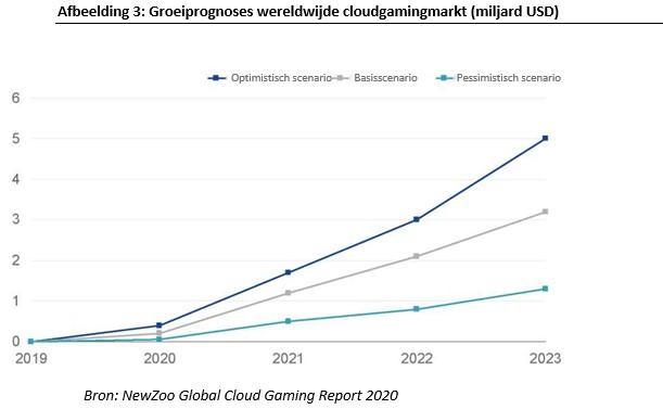 ‘Cloudgaming’, zoals aangeboden door Google Stadia, heeft buitengewoon veel potentieel. Bij cloudgaming wordt de content van videogames verwerkt in de cloud in plaats van op een PC of console. Daardoor zijn er hoogwaardige games beschikbaar voor iedereen met snel internet. Spelers hoeven geen dure consoles of games meer aan te schaffen, maar betalen via maandelijkse abonnementen. Het is waarschijnlijk dat het gebruik van games enorm gaat toenemen (zie afbeelding 3), in lijn met wat we ook hebben gezien bij muziekstreamingplatforms zoals iTunes.