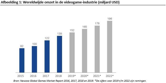 De huidige explosieve groei van de videogame-industrie moeten we plaatsen in de context van een bestaande hypergroeitrend. De verwachting is dat de wereldwijde omzet tussen 2015 en 2021 zal verdubbelen (zie afbeelding 1). Deze schatting dateert van voor de coronacrisis en kan daarom nog aan de voorzichtige kant zijn.