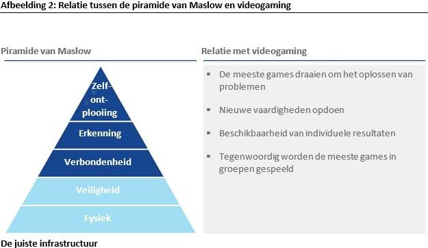 Je zou kunnen stellen dat videogames aansluiten op tenminste drie elementen van de beroemde behoeftenpiramide van Maslow: zelfontplooiing, erkenning en verbondenheid. In het kader van zelfquarantaine vanwege COVID-19 zou je veiligheid kunnen toevoegen als een behoefte waaraan wordt tegemoetgekomen (zie afbeelding 2).