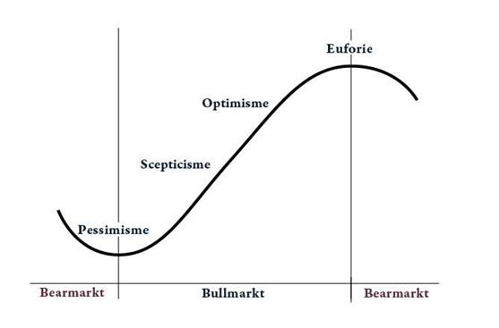 Volgens Fisher Investments Nederland kan de cyclus van het marktsentiment een krachtig instrument zijn bij het beoordelen van de markt. De bekende belegger Sir John Templeton beschreef de typische evolutie van het beleggerssentiment als volgt: “Stierenmarkten worden geboren uit pessimisme, groeien door scepticisme, rijpen door optimisme en sterven door euforie.” Dit is hieronder te zien in figuur 1.