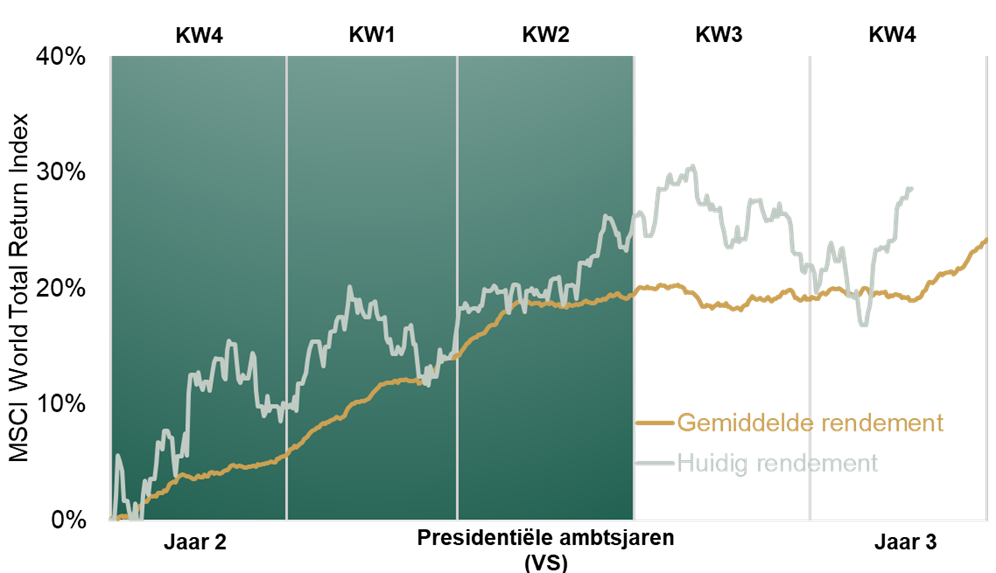 Bron: FactSet, as of 23-11-2023. Gemiddeld rendement van de MSCI World Total Return Index in het laatste kwartaal van het tweede jaar tot aan het einde van een Amerikaanse presidentiële cyclus, dagelijks, 01-10-1970 t/m 31-12-2019 en het rendement van de MSCI World Total Return Index, dagelijks, 30-09-2022 t/m 22-11-2023. Weergegeven in USD.