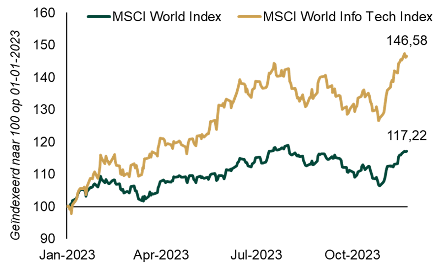 Bron: FactSet, per 23-11-2023. Het totaalrendement van de MSCI World Information Technology Index en MSCI World Index, dagelijks, van 01-01-2023 t/m 22-11-2023. Weergegeven in USD.