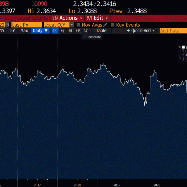 De rentecurve; de Amerikaanse tienjaarsrente afgezet tegen de inflatie.