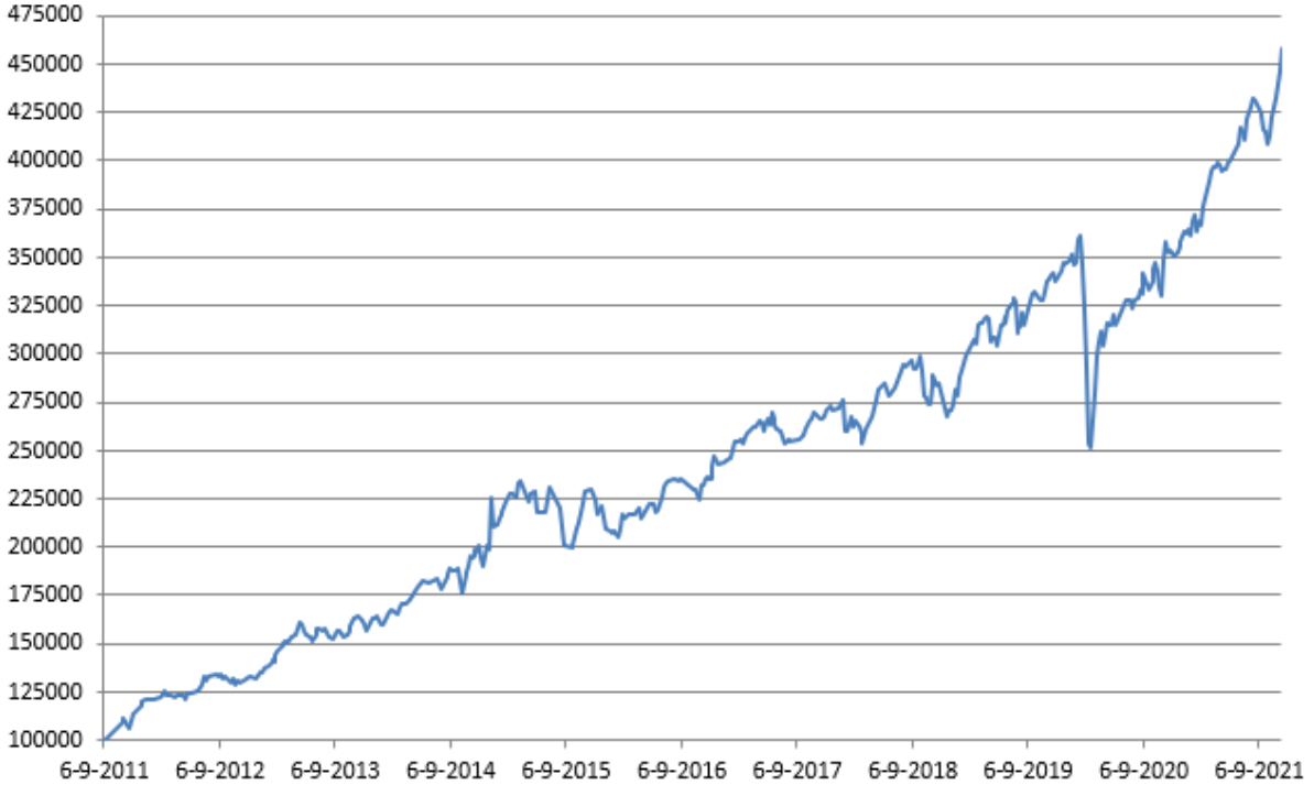 De Dividendportefeuille blijft uitstekend draaien, met op weekbasis ditmaal een winst van 2,7% tot een nieuw record van €458.497. Vooral de dollar – dit jaar +7,5% ten opzichte van de euro – stuwde het rendement de laatste weken.