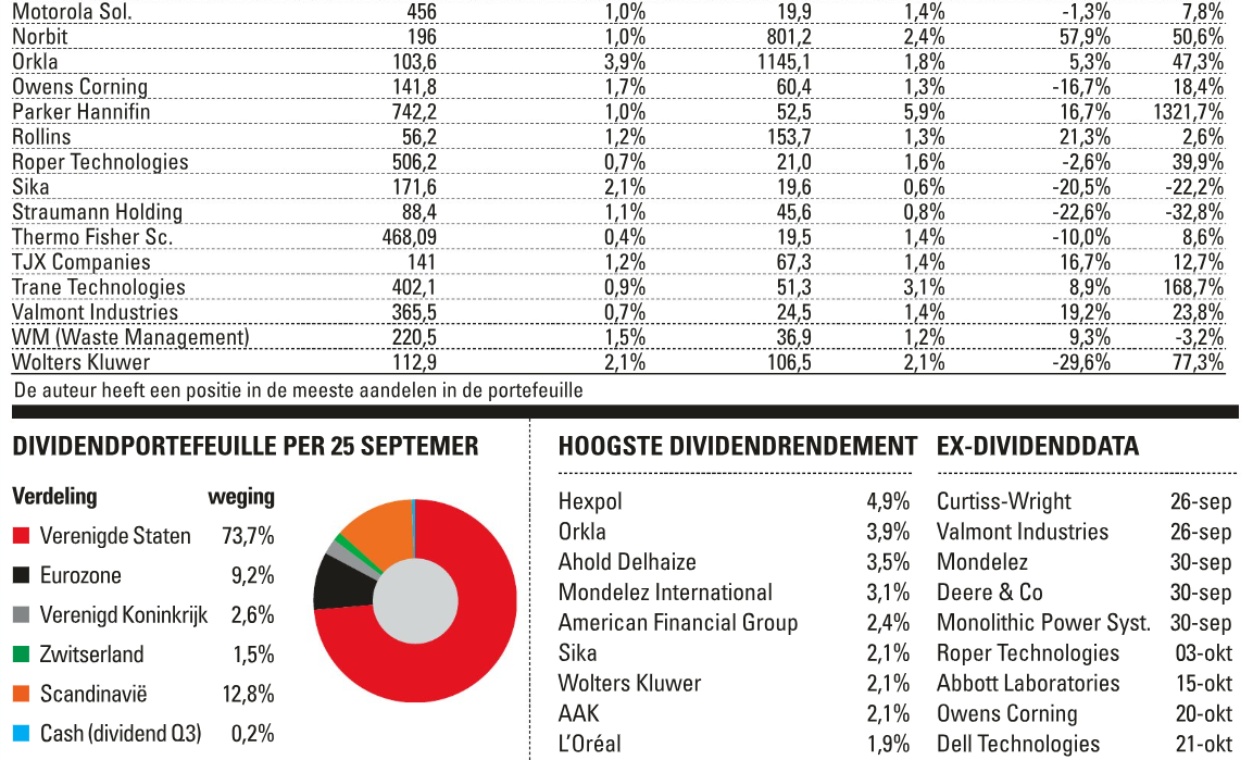 Op weekbasis was er verlies voor de meeste aandelen, aangevoerd door het Zweedse Lagercrantz dat 7,4% kwijtspeelde. Eli Lilly verloor als tweede ruim 6%. Niche-investeerder Lagercrantz, dat eind augustus ex-dividend ging, daalde zonder richtinggevend nieuws, maar was wel een van de hoogst gewaardeerde aandelen binnen de Dividendportefeuille, wat mogelijk tot winstnemingen heeft geleid na de hoogste koers ooit eerder dit jaar. Eli Lilly blijft een stuiterbal qua beurskoers, met bijna wekelijks scherpe bewegingen op nieuws over tarieven voor de farmasector of nieuwe testresultaten en/of goedkeuring van toezichthouders voor de bekende afslankmedicatie of nieuwe medicijnen zoals zeer recent tegen borstkanker en alzheimer.