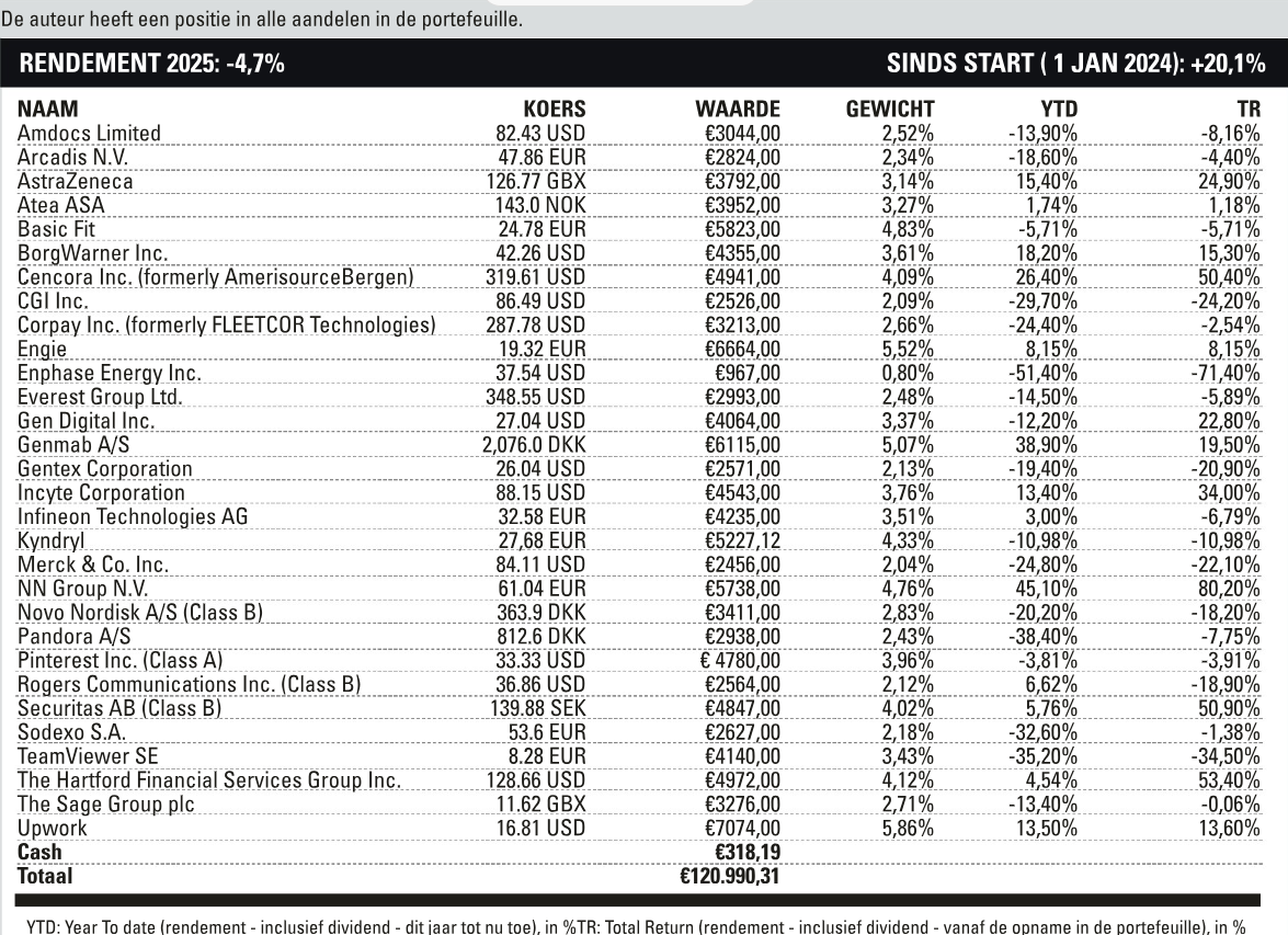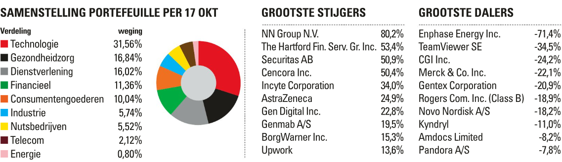In de afgelopen maand werd Alphabet geruild voor Kyndryl. De koers van Alphabet was sterk gestegen na de positieve uitspraak in de monopolie-rechtszaak. Daardoor was het grootste deel van de onderwaardering ingelopen. De koers van Kyndryl was juist stevig gedaald, terwijl de cijfers van het bedrijf aanzienlijk beter waren dan verwacht. Kyndryl is een spin-off van IBM waarin de IT-infrastructuurdiensten zijn ondergebracht. De koers van Kyndryl kwam verder onder druk toen Trump dreigde met nieuwe handelstarieven richting China.