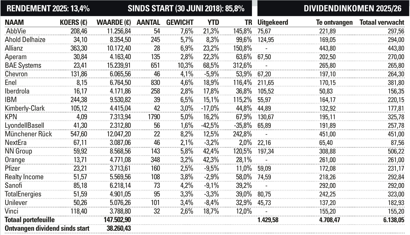 Tussen al dit koersgeweld door ontwikkelt de hoofddoelstelling van de Hoogdividendportefeuille, het genereren van een dividendinkomen van minimaal 4% van de portefeuillewaarde, zich geheel volgens plan. Na het net beëindigde eerste kwartaal van ons gebroken boekjaar hebben we 23% van het beoogde dividendinkomen van het jaar 2025/26 van ruim €6100 inmiddels binnen gekregen.