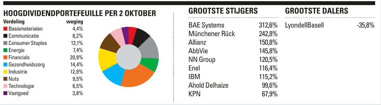 Overigens is het dividendrendement van de MSCI World High Dividend Index met 3,4% wel duidelijk lager dan de bijna 4,2% van de Hoogdividendportefeuille. Binnen de portefeuille loopt het dividendrendement zeer sterk uiteen. Chemieconcern LyondellBasell heeft een dividendrendement van 11,1% en helemaal aan de andere kant staat BAE Systems met een ‘yield’ van slechts 1,7%. BAE Systems tikte begin oktober maar weer eens een nieuw koersrecord aan, waardoor de weging van het defensieconcern in de portefeuille nu is opgelopen tot liefst 10,3% en daarmee komt herbalancering van deze positie in zicht.