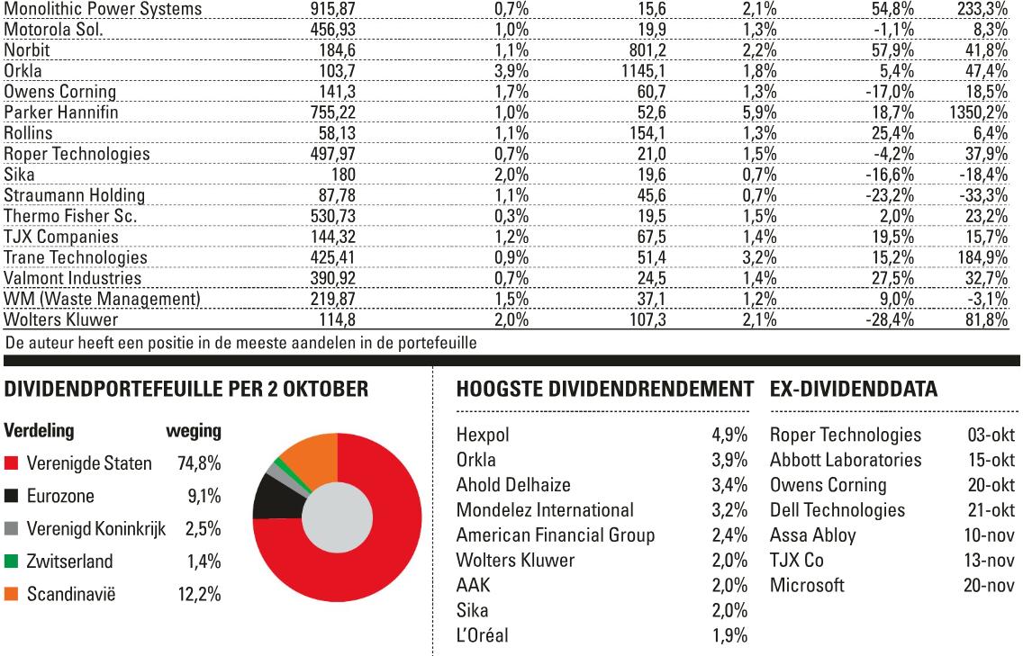 Concreet ging er in totaal $1180 aan ontvangen dividend in het derde kwartaal terug in de 32 aandelen die dat gezamenlijk uitkeerden. In Europa werd €275 (Ahold en Wolters Kluwer) en SEK 1107 (Lagercrantz) herbelegd. In totaal omgerekend dus €1381 aan nieuwe aankopen, waarmee de cashpositie weer op 0% start in het vierde kwartaal.