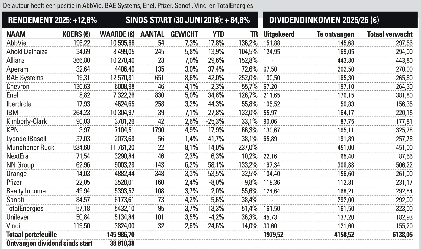 Na ruim elf maanden staat de Hoogdividendportefeuille op een rendement – inclusief ontvangen maar niet herbelegd dividend – van 12,8% over 2025. Dat is aanmerkelijk beter dan de ruim 5% van de MSCI World High Dividend Index, een index waarvan het dividendrendement met 3,3% wel een stuk lager ligt dan de 4,2% van de Hoogdividendportefeuille.