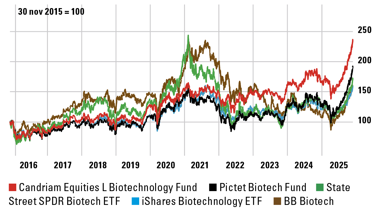 Beleggingsfondsen, waarbij de weging van aandelen het resultaat is van de keuzes van de beheerders, zijn een andere manier om gespreid in de sector te beleggen. Bijvoorbeeld in Candriam Equities L Biotechnology Fund (ISIN LU0942225912) en Pictet Biotech Fund (ISIN LU0255977372). Deze beide fondsen bestaan al ruim 25 jaar, met uiteraard verschillende beheerders, en beleggen in zestig tot zeventig aandelen. Zes daarvan – Alnylam, Insmed, Ionis, Neurocrine, Regeneron en United Therapeutics – zijn in de top tien van beide fondsen terug te vinden, zij het met een andere weging. De vijf grootste posities hebben een weging van 23-25% in deze twee fondsen die over de afgelopen tien jaar beide ETF’s ruim verslagen hebben (zie grafiek). Het in 1993 gestarte Zwitserse BB Biotech biedt een (nog) meer geconcentreerde portefeuille, van 20 tot 35 aandelen. De vijf grootste posities – Ionis, Argenx, Revolution Medicines, Neurocrine en Alnylam – hebben opgeteld een weging van bijna 54%.