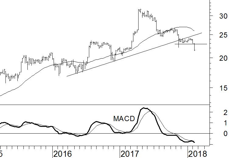 De eerstvolgende steun wordt gevormd door de bodem van eind 2016, die rond de €19,50 ligt. Daaronder liggen nog steunniveaus op €17 en €15,50. De indicatoren staan wel op ‘oversold’. Zo heeft de MACD-indicator de laagste stand in vijf jaar bereikt. Kortstondig herstel is hierdoor mogelijk, maar wij ontkomen er niet aan ons advies te verlagen naar ‘verkopen’.
