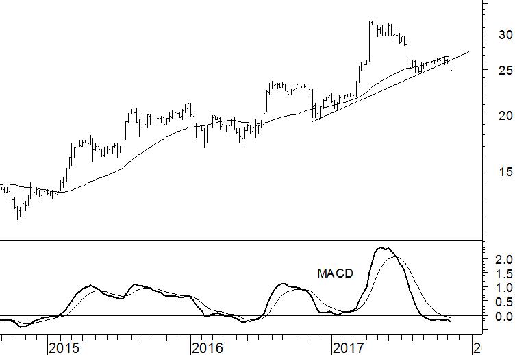 Accell beleefde een fantastisch begin van 2017. De koersexplosie bracht het aandeel zelfs boven €32, een record. De correctie van mei tot en met juli was een gezonde tegenreactie op de gestegen koersen. Nu blijkt echter dat de koopinteresse in aandelen Accell structureel tekortschiet om nog van een stijgende trend te kunnen spreken. Belangrijk bewijs daarvoor is de definitieve val onder het 40-weeks gemiddelde. Dat daarmee ook de steunlijn is gebroken, doet het technische beeld eveneens geen goed.