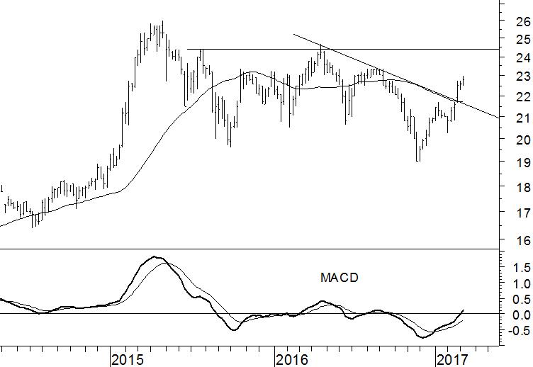 2017 verloopt tot dusver goed voor Acomo. De opmars die Acomo al in december inzette, maakte eerst nog deel uit van de grotere dalende trend. Dat veranderde nadat toegenomen koopinteresse de beurskoers boven de weerstand rond €21,50 had getild. Deze weerstand wordt gemarkeerd door de dalende weerstandslijn in combinatie met het 40-weeks gemiddelde.