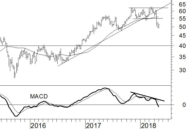 Daarna zakte de koers door deze lijn en vervolgens door de horizontale steun op €55. Het positieve plaatje is nu omgeslagen naar een meer neutraal beeld. ASMI kan verder verzwakken naar de steun van de vorige bodem rond €47. Daaronder wordt het beeld negatief.
