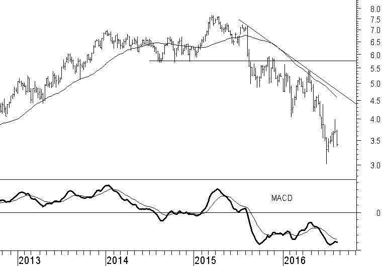 Aegon viert de eerste verjaardag van de dalende trend. De daling begon in augustus 2015, toen het steunniveau rond €5,75 krachtig werd doorbroken. Sindsdien is er weinig veranderd. Sterker nog, de opeenvolging van lagere toppen en bodems bevestigt de neerwaartse spiraal waarin Aegon vooralsnog gevangen zit. De meest recente bevestiging van de dalende trend is de lagere koerstop in de weekgrafiek. Het wachten is op het evenaren of doorbreken van de koersbodem van dit jaar op €3. Zelfs als Aegon een herstelbeweging inzet, ontsnapt het niet eenvoudig aan de dalende trend. Pas rond €4,50 komen het 40-weeks gemiddelde en de dalende weerstandslijn in beeld. Deze zullen eerst moeten worden doorbroken voordat er voldoende bewijs is dat de verkoopdruk definitief tot het verleden behoort. Aandelen Aegon horen dus nog steeds niet thuis in een Nederlandse aandelenportefeuille. Het verkoopadvies blijft van kracht.
