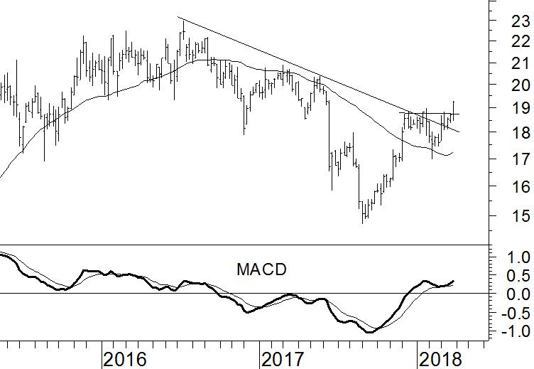 Beleggers kwamen toen even op adem. Recent hebben ze een nieuwe poging gewaagd om door de dalende weerstandslijn te breken. Dat lijkt nu te lukken. Als de uitbraak definitief slaagt door boven de horizontale weerstand (net onder €19) te blijven, dan verhogen we het advies naar ‘kopen’. Een belangrijk signaal komt van het 40-weeks voortschrijdend gemiddelde, dat een indicatie geeft van de langetermijntrend. Dit gemiddelde is veranderd van dalend naar stijgend.