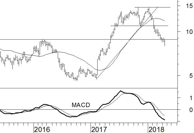 Een flinke verslechtering van het koersbeeld was voor ons aanleiding om Air France-KLM eind februari een houdadvies te geven. De daling heeft zich voorgezet en een verkoopadvies dreigt. Air France-KLM voltooide begin februari een dubbele topformatie. Er was een gelijktijdige negatieve divergentie met de MACD-indicator. De koerstoppen van medio en eind 2017 lagen op gelijke hoogte, maar de toppen in de MACD lagen toen op lagere niveaus. Ook ging het 40-weeks voortschrijdend gemiddelde dalen.