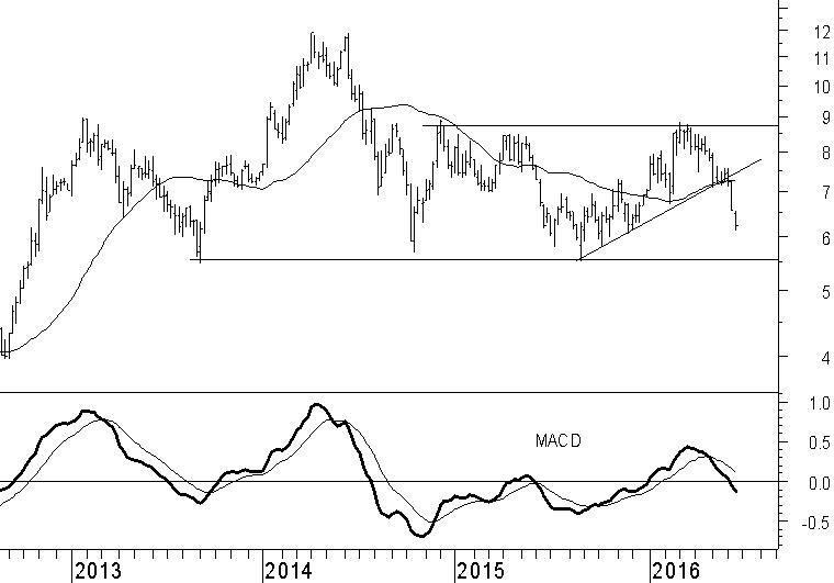 Air France-KLM leek begin dit jaar goed op weg om de weerstand rond €8,75 te breken. Helaas is dit toch een te moeilijke horde gebleken. Na het afketsen van het €8,75-niveau is de koers van het luchtvaartbedrijf bijna onafgebroken gedaald. Recent is daarbij het steunniveau rond €7,25 gebroken. Dit niveau werd bepaald door de oplopende steunlijn in combinatie met het 40-weeks gemiddelde. Inmiddels is ook de onderliggende MACD-indicator onder de nullijn gedoken. Al met al is dat een tastbare verzwakking van het technische beeld. Het opwaarts perspectief is hierdoor verloren gegaan. Air France-KLM loopt eerder het risico nog verder weg te zakken naar het belangrijke steunniveau rond €5,50. Tussen 2013 en 2015 is de koers van het aandeel meerdere keren opgeveerd vanaf dit niveau.
