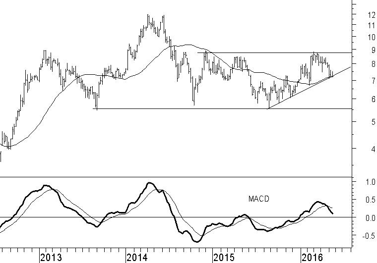 Air France-KLM had medio februari goede papieren om de verse stijgende trend een vervolg te geven. Zover is het vooralsnog niet gekomen en momenteel staat diezelfde stijgende trend onder druk. Al op de eerste hindernis rond € 8,75 lijkt het aandeel te zijn stukgelopen. Op dit moment wordt de onderliggende steunlijn rond €7 onder druk gezet. Dit niveau wordt gevormd door de genoemde steunlijn in combinatie met het 40-weeks gemiddelde. Een overtuigende doorbraak op weekbasis onder € 7 maakt een einde aan de stijgende trend. De kans daarop is zeker aanwezig omdat de MACD-indicator enkele weken geleden in neerwaartse richting is gekruist. Toch wachten wij op een definitieve neerwaartse doorbraak alvorens het advies te verlagen. Koopjesjagers weten immers dat het huidige koersniveau een stevige bodem legt onder de markt.