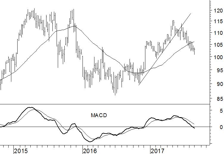Air Liquide hield zich tot begin mei netjes aan het protocol van de stijgende trend. Hogere toppen en bodems zijn het kenmerk daarvan. Al was de doorbraak van de onderliggende steunlijn in juni een tegenvaller, de schade aan het technische beeld bleef beperkt. Dat is anders geworden nu Air Liquide is teruggevallen tot onder het 40-weeks gemiddelde. Daarnaast is de MACD-indicator ook nog eens onder de nullijn gezakt: een aanwijzing dat het koersmomentum in neerwaartse richting draait.