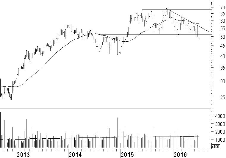 Na een periode van meer dan een jaar blijkt het steunniveau rond €51 geen soelaas meer te bieden voor overtollige verkoopdruk. Lange tijd hadden wij verwacht dat er rond dit niveau voldoende koopinteresse zou zijn om een verdere daling van de koers te voorkomen. Dat blijkt niet het geval. Met een krachtige beweging is Airbus onder het €51-niveau gebroken en daarmee een dalende trend begonnen. Juist aan het begin van een dergelijke trend kan een versnelling optreden. Dat maakt het aandeel de komende tijd kwetsbaar. In de komende maanden verwachten wij een verder afglijdende koersbeweging en hanteren we het € 40-niveau als koersdoel. Rond dat niveau werden in 2014 enkele koersbodems gevormd die nu als nieuw steunniveau kunnen fungeren.