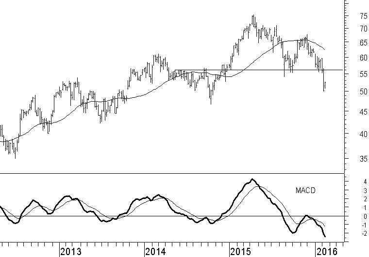 AkzoNobel liet in de loop van 2015 al zien dat de koopinteresse onder beleggers was afgenomen. Een belangrijke aanwijzing daarvoor was de vorming van een lagere koerstop in november die niet hoger wist uit te komen dan het 40-weeks gemiddelde. Deze gemiddeldelijn kent sindsdien ook een dalend verloop. Van recente datum is de val onder het steunniveau rond €56. Naast de lagere koerstop wordt ook een lagere bodem gevormd en hiermee voldoet de weekgrafiek van AkzoNobel aan de definitie van een dalende trend. In de komende weken tot maanden verwachten wij dat de koersdruk op het aandeel zal aanhouden en de stijgende trend zich zal uitbouwen. Op de wat langere termijn houden wij daarvoor een koersdoel aan rond €42. In dat geval is AkzoNobel weer terug bij het dieptepunt van 2013.
