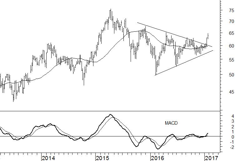 AkzoNobel start een nieuwe positieve fase. Het aandeel heeft zich meer dan een jaar in een symmetrisch driehoekspatroon voortbewogen, maar nu is het aandeel in opwaartse richting uit de driehoek gebroken. Daarmee is een nieuwe stijgende trend in gang gezet, zoals ook blijkt uit het patroon van hogere toppen en bodems.