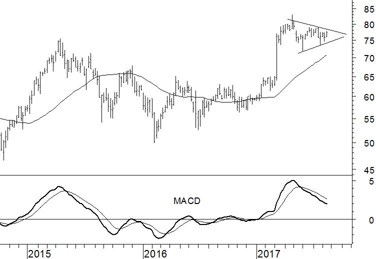 Inmiddels lijkt de strijdbijl begraven en bepalen vraag en aanbod weer het koersbeeld. Dan valt op dat in de laatste maanden een klein driehoekspatroon is gevormd. Doorgaans is dit een aanwijzing van een tijdelijke pauze in de voorafgaande trend. Dat betekent dat uiteindelijk het driehoekspatroon aan de bovenkant moet worden verlaten. Hoe het ook zij, het hoogtepunt van dit jaar op €83 is nog steeds ons koersdoel. Voorlopig zien wij dan ook geen aanleiding om het bestaande koopadvies in twijfel te trekken.
