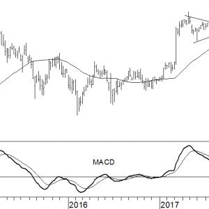 AkzoNobel kent nog steeds een positief technisch beeld. Dat is al het geval sinds eind januari, nog voordat het bedrijf werd geconfronteerd met een ongewenste overnamepoging. Vaak loopt de beurskoers al op voorafgaand aan de aankondiging van een overname, zodat voor de technisch analist de stijgende trend zichtbaar wordt.