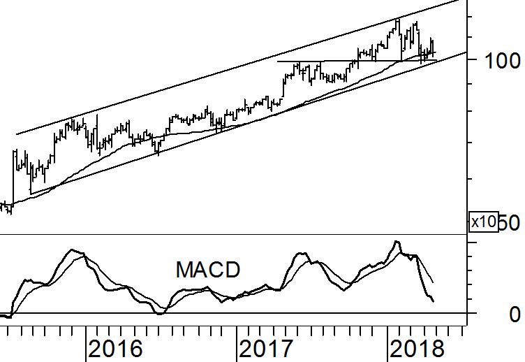 Koerstechnisch is Alphabet er de afgelopen negen maanden niet op voor- of achteruitgegaan. Ook aan het verloop van de opwaarts gerichte langetermijntrend is weinig veranderd. Wat wel is veranderd is de fase van de trend waarin het aandeel zich bevindt. Begin dit jaar was dat aan de bovenkant van het trendkanaal, maar na de correctie van de afgelopen maanden situeert de koers zich nabij de onderkant.