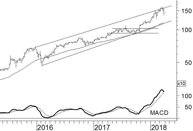 Toch houden we rekening met een flinke correctie, die we in eerste instantie als ‘gezond’ zullen betitelen. De koers is namelijk wel erg hard gestegen. De MACD heeft een historisch hoge stand gekregen en geeft een overspannen overbought-situatie aan, oftewel het aandeel is te veel gekocht. Zelfs als de koers helemaal naar de onderkant van het trendkanaal zou zakken – wat nogmaals een daling van $20 betekent – blijft Amazon op ‘kopen’ staan.
