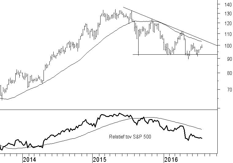 Apple (AAPL) gaat gebukt onder een negatief technisch beeld. In de weekgrafiek is te zien dat de belangrijkste toppen vanaf medio 2015 telkens op een lager niveau zijn geplaatst. Dat betekent dat de koopinteresse op steeds lagere niveaus wordt gestaakt. Mede als gevolg daarvan kent het 40-weeks gemiddelde een neerwaarts verloop met de koers van Apple daaronder. Allemaal aanwijzingen dat de trend neerwaarts gericht blijft. Wel positief is dat het tempo van de dalingen afneemt; er is zelfs sprake van een stabiliserend koersverloop. Daarvoor is vooral het steunniveau rond $93 van belang. Bij een doorbraak boven $102,50 zal het technische beeld in belangrijke mate verbeteren. Zover is het nog niet en Apple blijft kwetsbaar voor een terugval naar $93. Ten opzichte van de S&P 500 presteert het aandeel nog steeds uiterst zwak. Het verkoopadvies blijft dan ook gehandhaafd.