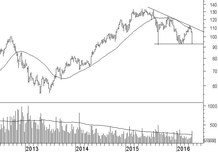 Apple (AAPL) is begin januari door ons op de verkooplijst gezet. In maart bespraken wij de herstelbeweging in het aandeel, die pas rond $110 serieuze weerstand tegemoet kon zien. De gecombineerde weerstand van de dalende weerstandslijn en het 40-weeks gemiddelde hebben inderdaad een stevige blokkade opgeworpen rond $110. De koersdruk van afgelopen week ging gepaard met bovengemiddelde omzetten. Dat geeft aan dat beleggers een grote interesse hebben om aandelen Apple te verkopen. Voor ons is dat een bevestiging van de dalende trend. Wel is Apple momenteel aangeland op het belangrijke steunniveau rond $93. Binnen een jaar heeft dit niveau tot tweemaal toe voor een draai gezorgd in de koersontwikkeling. Wellicht ook deze keer. Maar op de langere termijn schatten wij de dalende trend sterker in, waarmee een val onder $93 onvermijdelijk wordt. Het verkoopadvies blijft gehandhaafd.