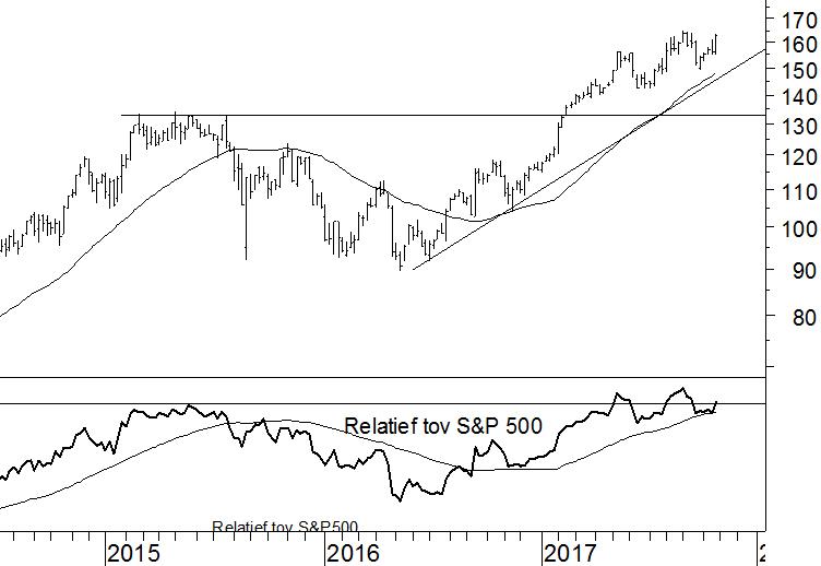 Apple wist begin dit jaar de oude top uit 2015 te doorbreken. Een zeer positief signaal. Niet onopgemerkt mag echter blijven dat het aandeel ten opzichte van de S&P500 al sinds 2012 een neutraal relatief koersverloop laat zien. In de afgelopen zeven jaar had een belegging in de S&P500 dus evenveel gerendeerd als een investering in het tech-aandeel (afgezien van dividenden; met dividend wint de S&P500).