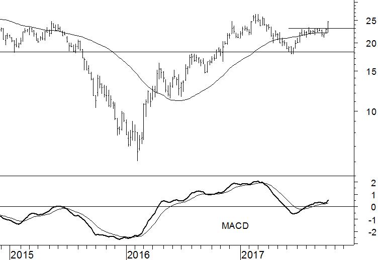 ArcelorMittal is in een paar maanden tijd flink opgeknapt. Het aandeel dreigde eerder dit jaar in een dalende trend terecht te komen, maar rond het €18-niveau keerde de koopinteresse onder beleggers terug. Tot vorige week was echter geen sprake van een positief technisch beeld. Immers, de koers bewoog zijwaarts rondom het 40-weeks gemiddelde. Vraag en aanbod waren met elkaar in evenwicht. Daarin is verandering gekomen nu ArcelorMittal met kracht boven de weerstand rond €23 is gebroken. Hierdoor treedt een nieuwe stijgende trend in werking.