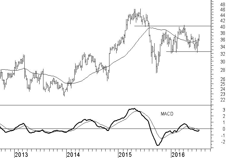 ASM International zit al langere tijd gevangen in een brede bandbreedte. Aan de onderkant wordt deze bepaald door een aantal koersbodems rond €32,50. Recent heeft dit steunniveau voor een opleving gezorgd in het koersverloop. Daarbij is het 40-weeks gemiddelde naar boven toe gekruist, en dat is een eerste voorwaarde voor een verdere opmars naar de bovenkant van de bandbreedte, die wordt begrensd door de weerstand rond €40. In de komende weken is dat het maximale potentieel. Alleen wanneer de bovengrens rond €40 wordt doorbroken wordt het interessant om het aandeel voor langere tijd in de portefeuille op te nemen. In dat geval ontstaat een flink potentieel naar een koersdoel rond €50. Dat alles blijft echter toekomstmuziek. Het risico bestaat namelijk dat het huidige neutrale technische beeld niet verder verbetert. Voorlopig is er dan ook geen enkele reden om het bestaande houdadvies voor ASM International aan te passen.