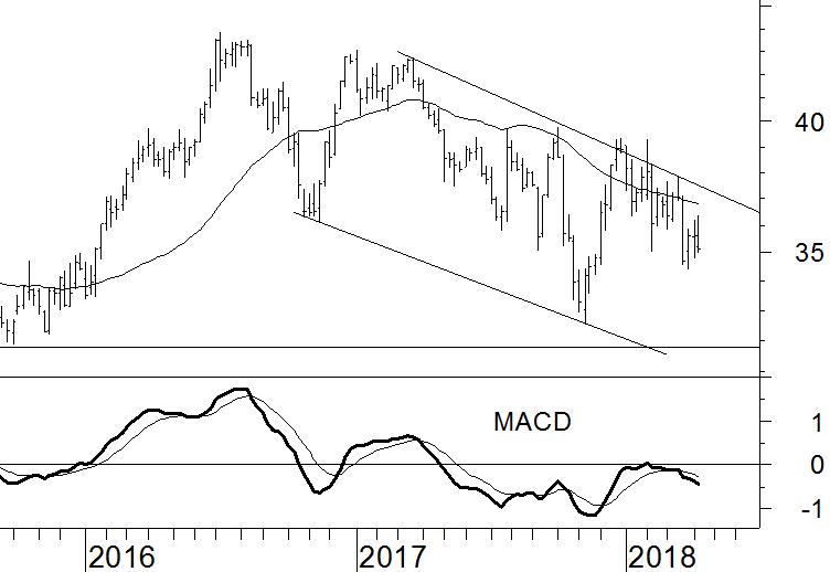Ondertussen heeft de neerwaartse trend de vorm gekregen van een symmetrisch dalend kanaal. Daarbij zakken de weerstands- en steunlijn parallel aan elkaar. Eind vorig jaar, begin dit jaar testte de koers de weerstand van de bovenkant van het kanaal. Die test was succesvol, in die zin dat de weerstandslijn niet werd doorbroken. Het is nu aannemelijk dat de koers de onderkant van het kanaal gaat opzoeken. Net onder de $32 ligt nog belangrijke horizontale steun.