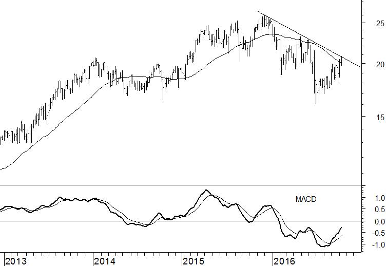 AXA heeft de afgelopen maanden een indrukwekkende opmars laten zien, maar dat is vooralsnog niet meer dan een tegenreactie binnen de bestaande dalende trend. De weekgrafiek geeft het ritme van de dalende trend duidelijk weer. Wel drukt AXA nu tegen een belangrijke bovenliggende weerstand rond €20, waardoor er feitelijk geen opwaarts potentieel is. Deze weerstand wordt gevormd door een combinatie van de weerstandslijn met het 40-weeks gemiddelde.