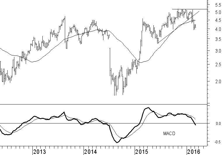 BAM heeft lange tijd kunnen profiteren van een positief technisch beeld. De laatste weken komt daar echter de klad in. Nadat in februari de steunlijn was gebroken, sneuvelde ook het 40-weeks gemiddelde. En dat laatste is een belangrijke verzwakking van het technische beeld. De vraag is in hoeverre de stijgende trend nog intact is. Aangezien de onderliggende MACD-indicator nu voor het eerst in meer dan een jaar onder de nullijn is gedoken is ons vertrouwen in een zonnig toekomstbeeld voor BAM verdwenen. In de komende weken gaan wij uit van een meer zijwaarts koersverloop waarbij de ondergrens wordt gemarkeerd door het dieptepunt van juni vorig jaar op €3,30. Herstelbewegingen zijn zeker mogelijk maar vormen geen onderdeel meer van een structurele stijgende trend.