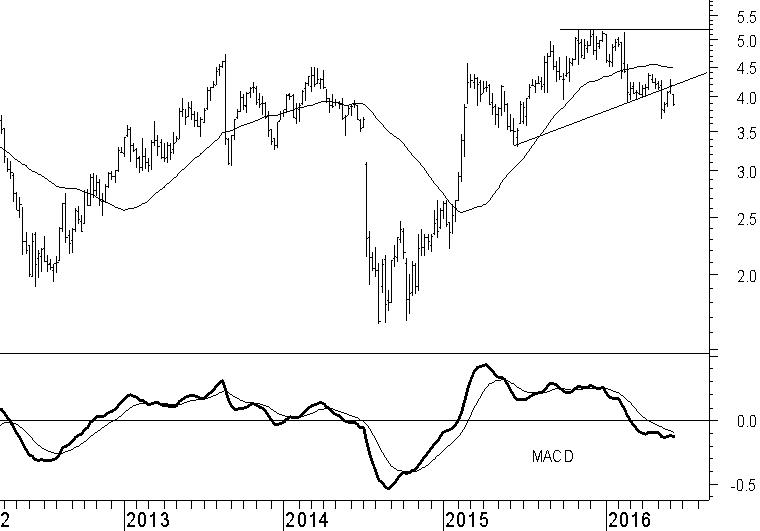 BAM heeft in enkele maanden tijd een draai gemaakt naar een negatief trendbeeld. Eind vorig jaar waren de vooruitzichten nog positief en handelde het aandeel op het hoogste niveau in vijf jaar. Het eerste teken van verzwakking kwam nadat begin dit jaar het aandeel onder het 40-weeks gemiddelde zakte. De laatste weken is het technische beeld verder verzwakt. Vooral de val onder het steunniveau rond €4,00 geeft aan dat beleggers de aandelen liever kwijt dan rijk zijn. Een bevestiging van het zwakke trendbeeld is de negatieve positie van de MACD-indicator onder de nullijn. De komende weken en maanden verwachten wij een aanhoudende koersdruk. Een richtpunt daarvoor is het dieptepunt van 2015 dat rond €3,30 het eerste steunniveau vormt. Uiteindelijk verwachten we dat de dalende trend zich zal uitbouwen tot nog lagere niveaus. Met dit vooruitzicht is er geen alternatief voor een verlaging van het advies naar ‘verkopen’.