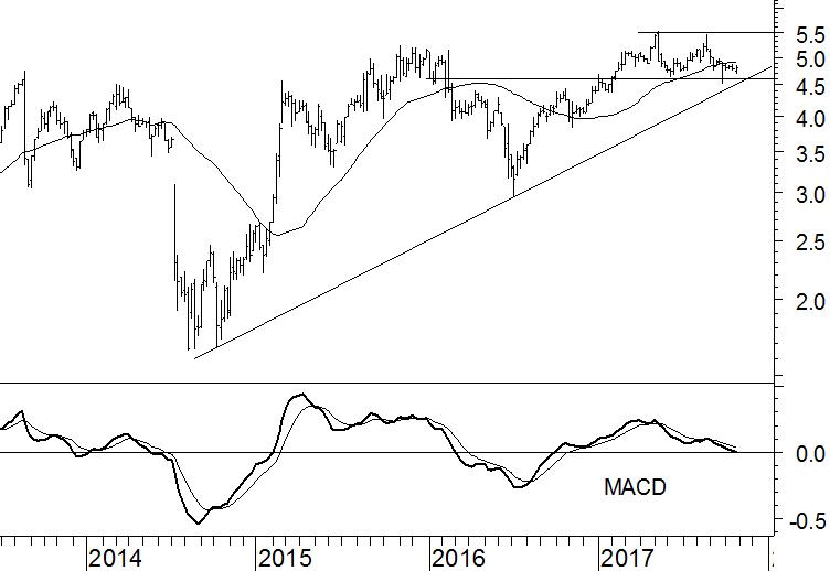 BAM fluctueert de afgelopen tijd een beetje zijwaarts in een range tussen €4,60 en €5,50. Dit is geen reden tot zorg. In een positief scenario vormt het aandeel namelijk aan de onderkant van deze range een nieuwe hogere bodem in relatie tot de majeure bodems in 2014 en 2016. Vervolgens kan het aandeel de weerstand op €5,50 doorbreken. Dit scenario schetst het logische vervolg van de koersbeweging die in 2014 werd ingezet.