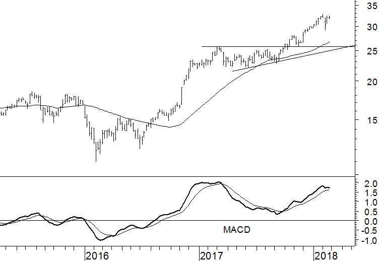 Bank of America blijft op koers. BAC kenmerkt zich in de weekgrafiek al sinds augustus 2016 door een stijgende trend. Voorlopig zien wij daarin geen verandering komen. Het trendbeeld oogt uiterst gezond, met een stabiel patroon van hogere toppen en bodems. Ook de MACD-indicator is nog steeds positief gekruist. Tussentijdse correcties zijn altijd mogelijk en vinden een stevig steunniveau rond $27-$28. Beleggers met hoogtevrees kunnen daarop wachten. Maar of het tot een correctie komt is nog maar de vraag.
