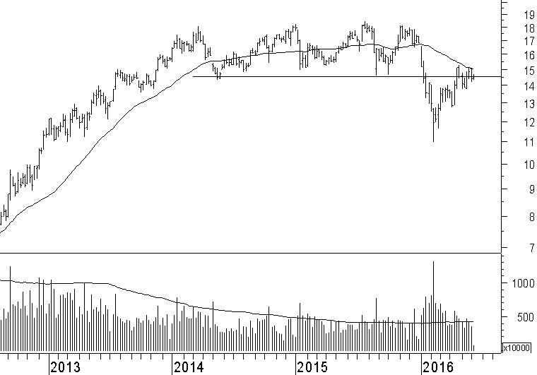 Bank of America (BAC) toont de laatste maanden een indrukwekkend herstel. Dit herstel volgt op de verzwakking van het technische beeld die in februari zijn intrede deed na de val onder het steunniveau rond $14,50. Het destijds geplaatste koersdoel op $11,75 werd in korte tijd bereikt. Maar inmiddels is Bank of America weer terug bij het oorspronkelijke uitbraakniveau. De vraag is of het herstel doorzet en het oude steunniveau rond $14,50 nu definitief als weerstand wordt gebroken. Onze verwachting is van niet. Een belangrijke hindernis is nog niet genomen. En dat is het 40-weeks gemiddelde dat nu rond $15 het zicht belemmert op hogere niveaus. Pas wanneer deze horde is genomen neemt het risico op een onmiddellijke koersdaling af.