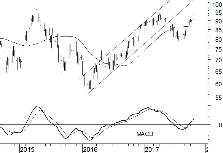BASF worstelt met een top uit 2015, die iets onder €100 ligt. Dit is de top van de trend die het aandeel van €20 in 2009 naar net geen €100 bracht. Wat volgde was een spectaculaire terugval in een jaar tijd tot onder €60 en een even indrukwekkend herstel in wederom een jaar tijd, tot €95 in april dit jaar. Sindsdien zijn we weinig opgeschoten. Wel laat de MACD-trendindicator de afgelopen weken een positief verloop zien. Daarnaast staat de indicator boven nul. Dat zijn positieve signalen.