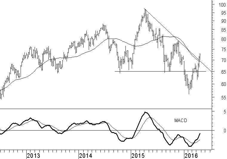 BASF heeft in een aantal weken tijd een belangrijke verbetering laten zien. Dat zag er begin januari wel anders uit. Toen sneuvelde het steunniveau rond €65 en stortte het aandeel zich in een dalende trend. Onze verwachting was dat deze dalende trend zou doorzetten tot het koersdoel op €54. Uiteindelijk scheelde het niet veel, maar dit richtpunt werd niet bereikt. Het daaropvolgende herstel liet zich in eerste instantie uitstekend kenschetsen als een herstelbeweging tegen de dalende trend. Zelfs toen de oude steun rond €65 niet sterk genoeg bleek als weerstand, veranderde dat niets. Inmiddels is dat wel het geval. Vooral de doorbraak boven €70 laat zien dat de verkoopdruk is afgenomen. Dit niveau werd namelijk bepaald door de gemiddeldelijn en de weerstandslijn. Het onmiddellijke risico voor een koersdaling is nu geweken, waardoor wij het advies verhogen naar houden.