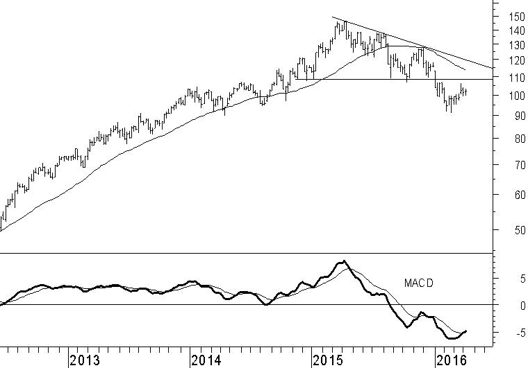 Bayer gaat al sinds begin januari, toen het aandeel onder het steunniveau rond €109 zakte, gebukt onder een negatief technisch beeld. Na een initiële daling volgend op de doorbraak van het steunniveau is nu sprake van herstel. Overtuigend is het alleen niet. Het is niet verrassend dat het herstel stukloopt in de nabijheid van het oude steunniveau dat nu dienst doet als weerstand rond €109. Vlak daarboven oefent ook het 40-weeks gemiddelde de nodige druk uit op het koersverloop. Al met al blijft het patroon van lagere toppen en bodems en daarmee van een dalende trend intact. Het enige lichtpunt is de positieve kruising van de MACD-indicator. Daarmee zou de kracht van de dalende trend iets kunnen afnemen.