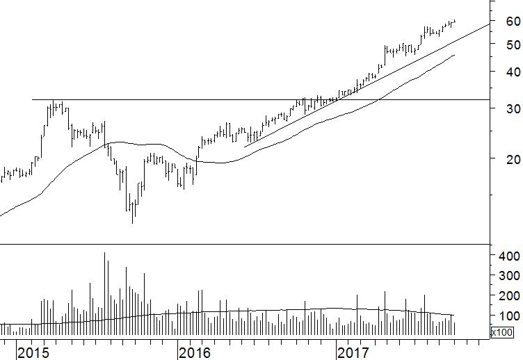 Besi blijft in de belangstelling staan van beleggers. Sinds de start van de stijgende trend in februari 2016 is de koers verdrievoudigd. Het koersdoel op €60 is op een haar na bereikt. IJzersterk is dat Besi al meer dan anderhalf jaar in een strak patroon van hogere toppen en bodems beweegt. Daarbij is de beurskoers zelfs niet in de buurt geweest van het 40-weeks gemiddelde.