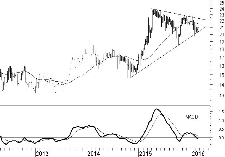 Beter Bed bevindt zich al bijna een half jaar in een neutraal koerspatroon. Dat koerspatroon wordt bepaald door een reeks van lagere toppen in combinatie met hogere bodems. Per saldo wijst dit op een mate van besluiteloosheid onder beleggers. Het koerspatroon wordt aan de onderkant begrensd door de oplopende steunlijn rond €20,50. De nabijheid van dit steunniveau maakt opleving mogelijk. Maar tegelijkertijd is het een tegenvaller dat het 40-weeks gemiddelde in zuidelijke richting beweegt en dat de onderliggende MACD-indicator weer onder de nullijn is gekruist. Hierdoor is het negatieve scenario van een koersval onder €20,50 nog niet verkeken. Een tastbaar bewijs daarvan geeft het startsignaal voor een dalende trend. Aan de andere kant is een beweging naar de bovenkant van het huidige patroon rond €22,50 ook mogelijk.